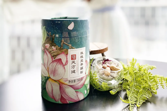 「玫瑰坚果藕粉」除了有口感粉滑的藕粉外,还有高达45%以上含量的坚果与果干,一共七种好料搭配,既能享受坚果的爽脆,又有果肉酸甜的味蕾刺激,还有浓郁玫瑰花香迎面扑鼻,层层风味,兼具美味与营养。