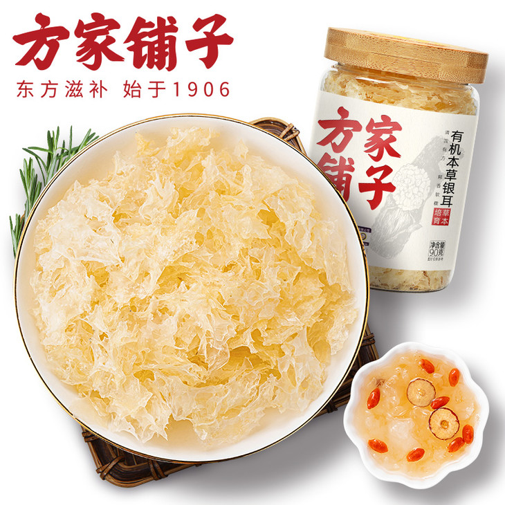 方家铺子本草银耳培养基以天然盐肤木及枸杞为主要原料,添加莲子、山药、茯苓等12味滋补食材进行药食同源科学配比,精心培植60天而出这洁白如玉,朵形适中,耳瓣肥厚的本草好银耳。因此本草银耳风味和香气更为丰富。在品质、口感、营养等方面,也比常见银耳更加出色。