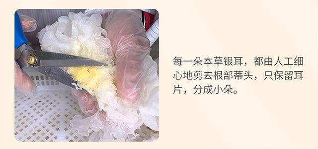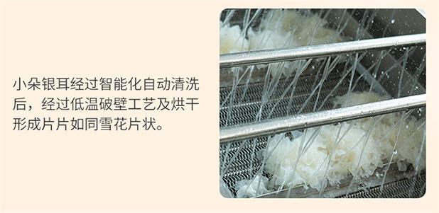 每一朵本草银耳,都由人工细心地剪去根部蒂头,只保留耳片,分成小朵。小朵银耳经过智能化自动清洗后,经过低温破壁工艺及烘干形成片片如同雪花片状。这种技术可以加快营养物质的释放,促进我们人体的快速吸收。