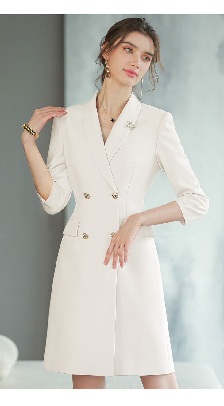 设计亮点:西装领、收腰剪裁、双排扣设计,裙长通常在膝盖上,更端庄