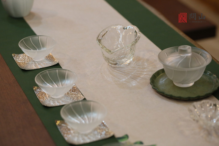 这一系列的盖碗以荷花为形,公道杯、斗笠杯卷边蜿蜒若青青荷叶,品茗杯则是以盛放的莲花为灵感,在这一系列里,莲,是最主要的元素。