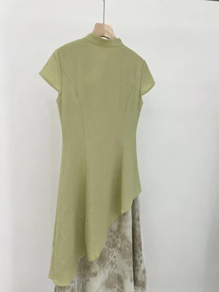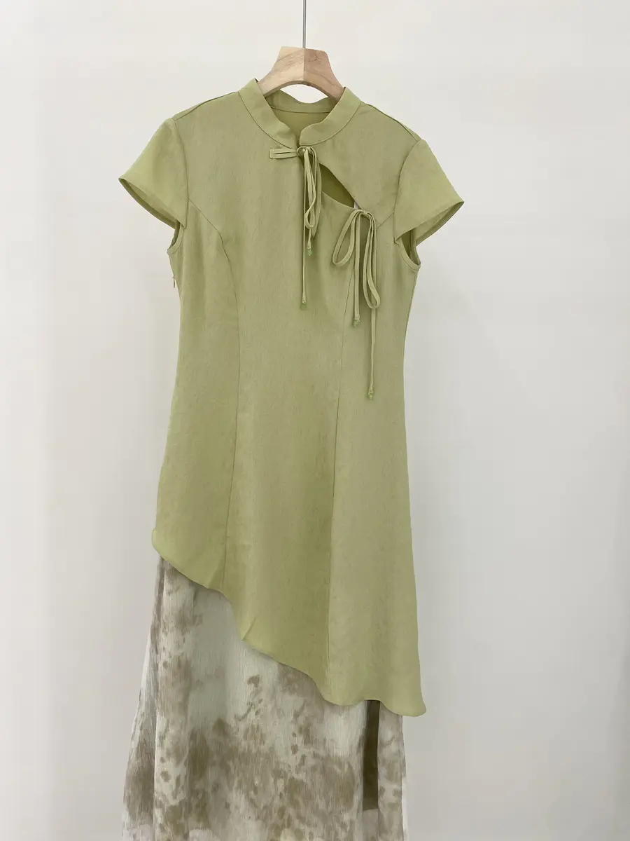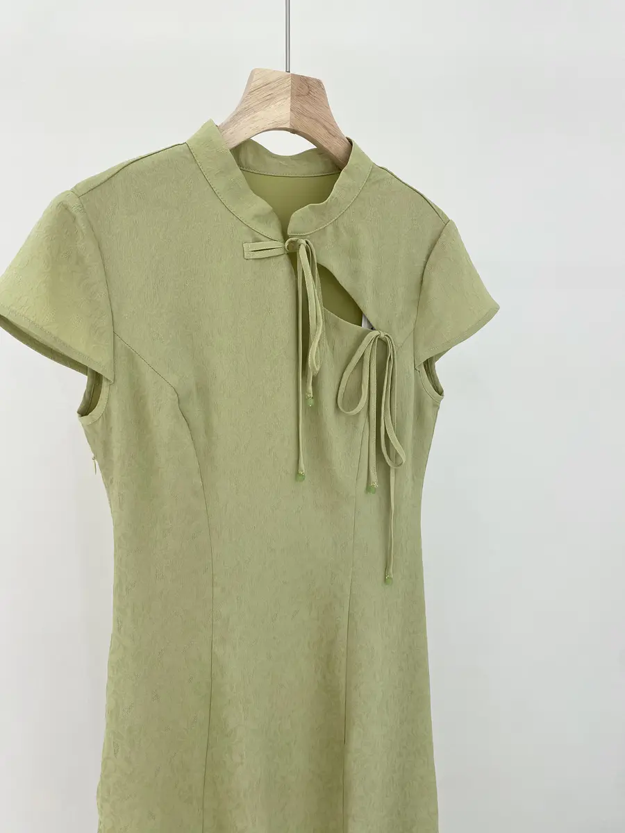上半身绿色采用提花面料,细看非常精致,并且有点芥末色的味道,无论黄白皮都很衬肤。上身以改良旗袍为设计点,通过镂空以及盘扣的点缀,增加中式韵味