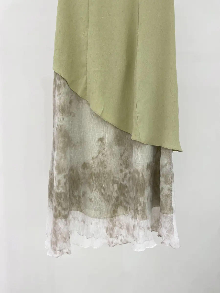 裙摆斜裁拼接打褶晕染雪纺,层层叠叠,仿佛坐在一片微波粼粼的湖边小石头上,静静冥想~