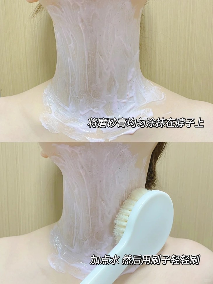 然后在脖子上均匀涂抹磨砂膏