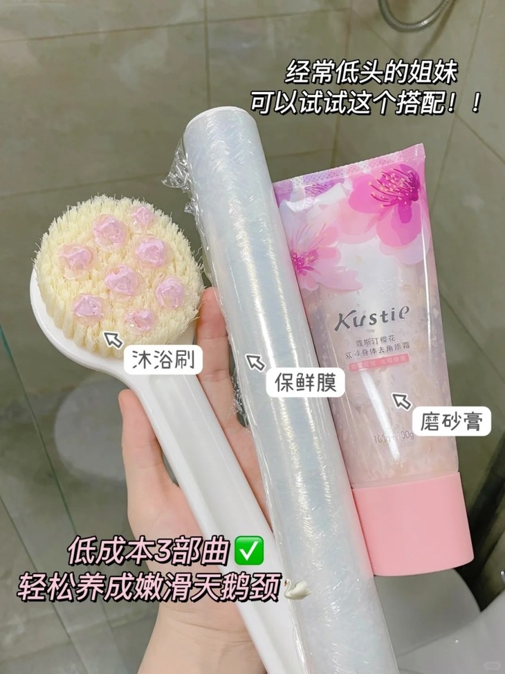 去角质的磨砂膏✅保鲜膜✅沐浴刷✅