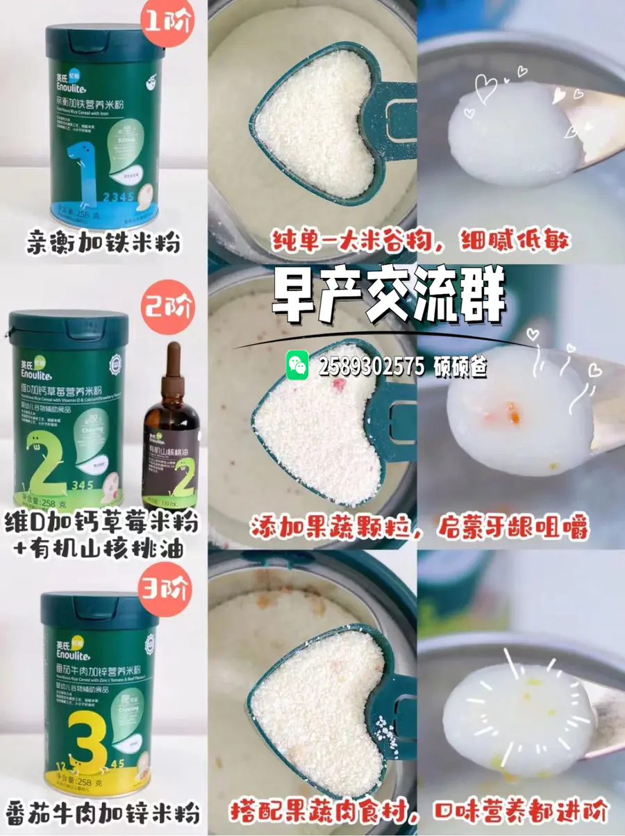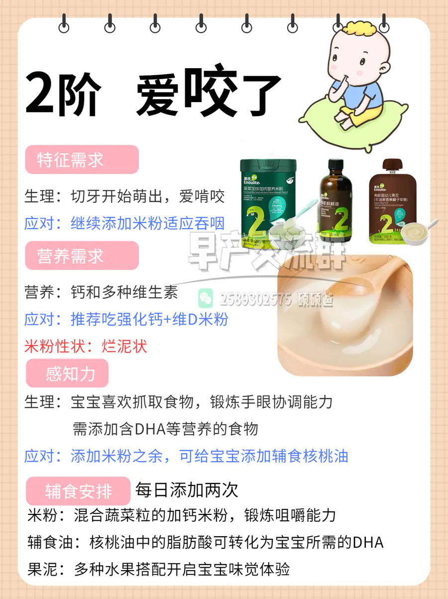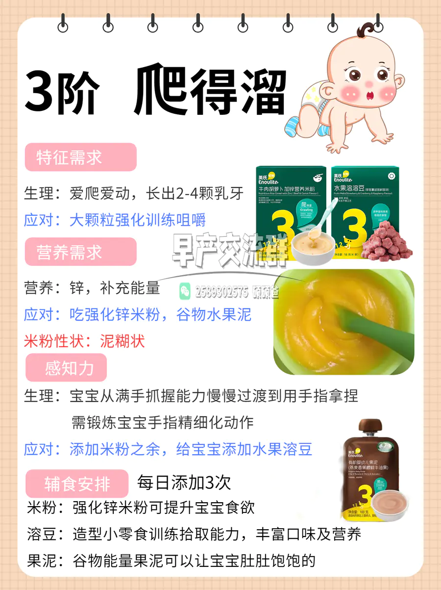 英氏3阶对应在米粉中加入大颗粒脆粒,训练宝宝牙齿嚼碎能力,同时注意补锌防止宝宝厌食挑食。