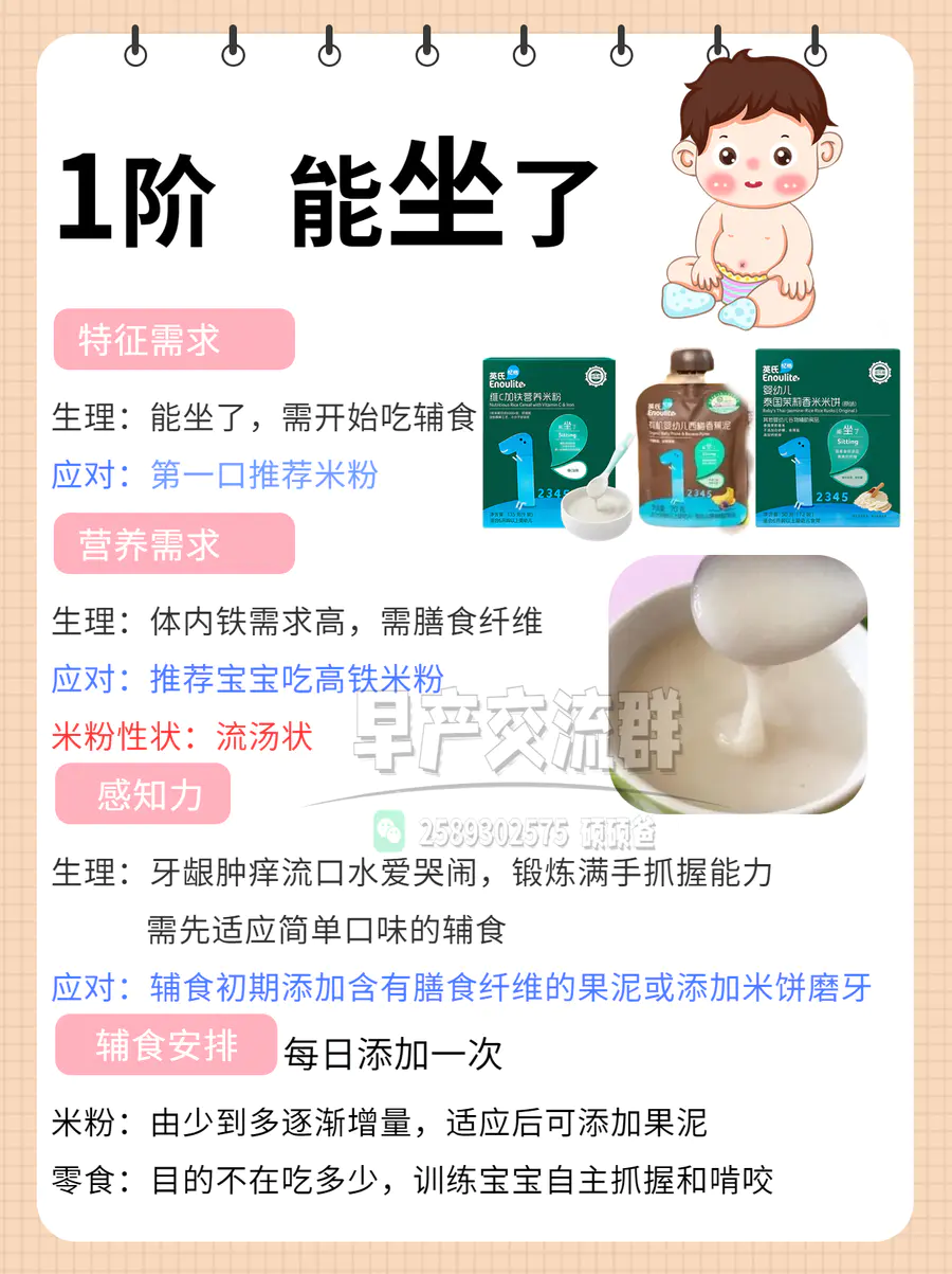 6个月左右宝宝能在物体的支撑下坐起,头部能稳稳支撑颈部。此时宝宝体内铁元素需求高,因此宝宝的第一口辅食应该添加富含铁的米粉——英氏准备的细腻好吸收,强化二价铁的1阶米粉。