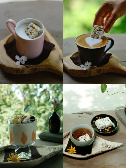 既然可以泡水,当然也可以米花糖+红茶、米花糖+燕麦奶、米花糖+拿铁,甚至是米花糖+植物酸奶。