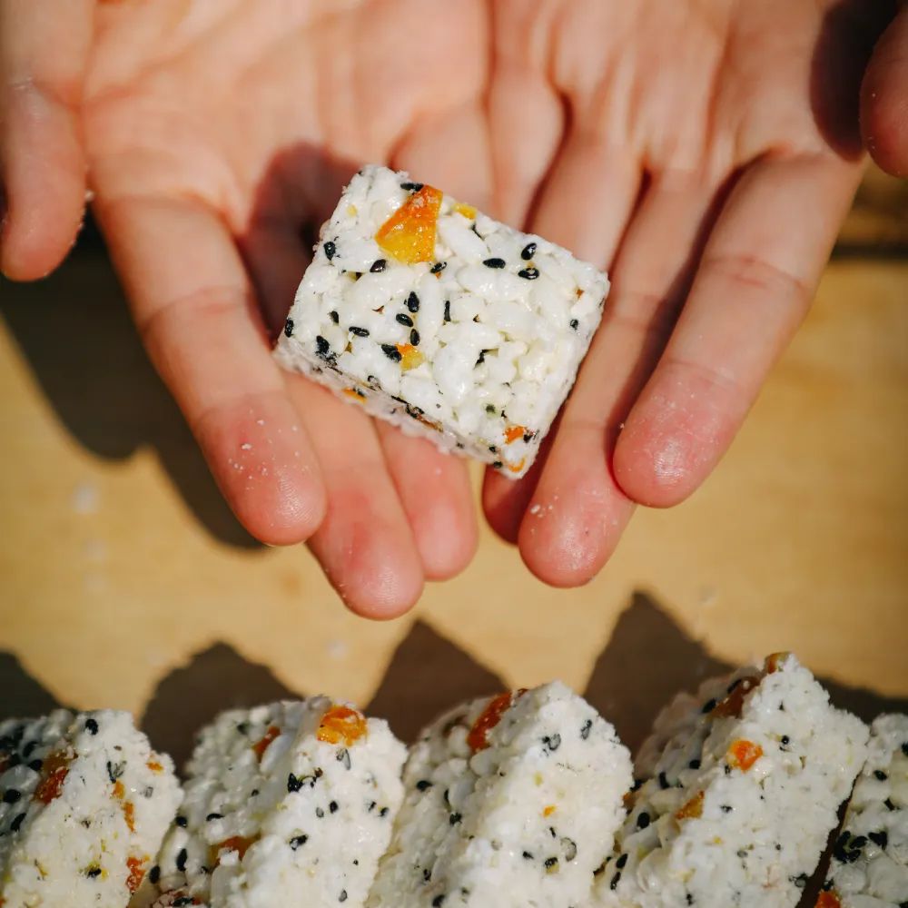 借着一个契机,丑美阿柑与蒲议米花糖联合起来,光是糖渍橘皮里的糖就测试了9种,打样10多次,才有了这款味道惊艳的阿柑米花糖,健康、美味、0添加。