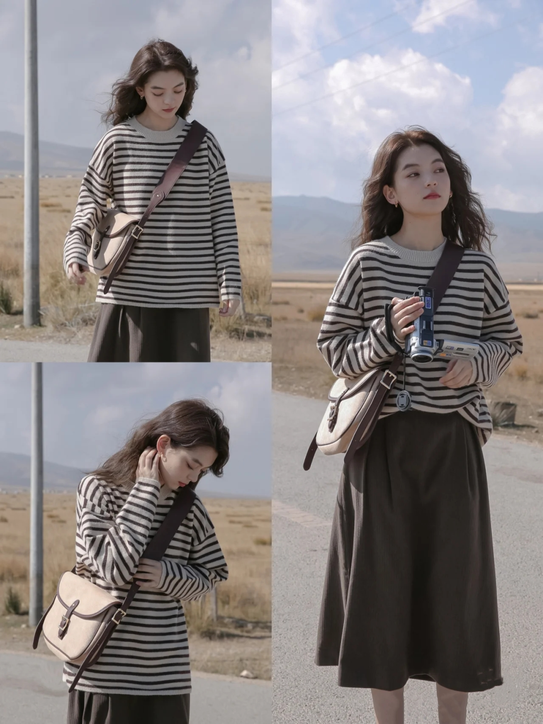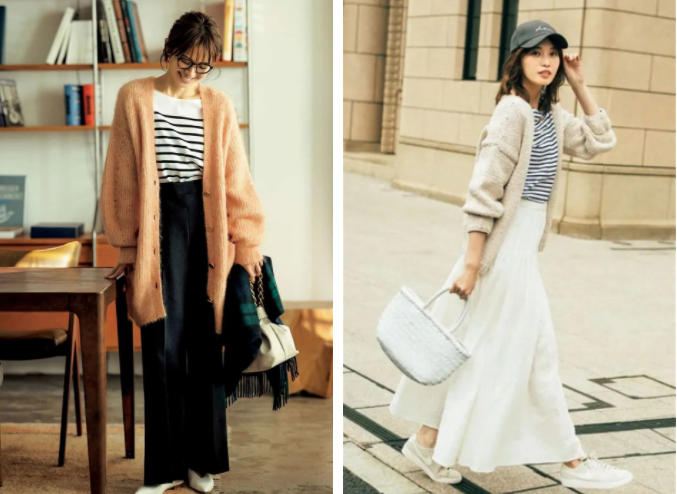 条纹衫+奶奶衫,诠释清新温柔的邻家女孩风;