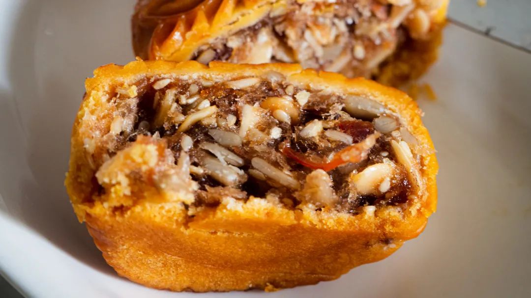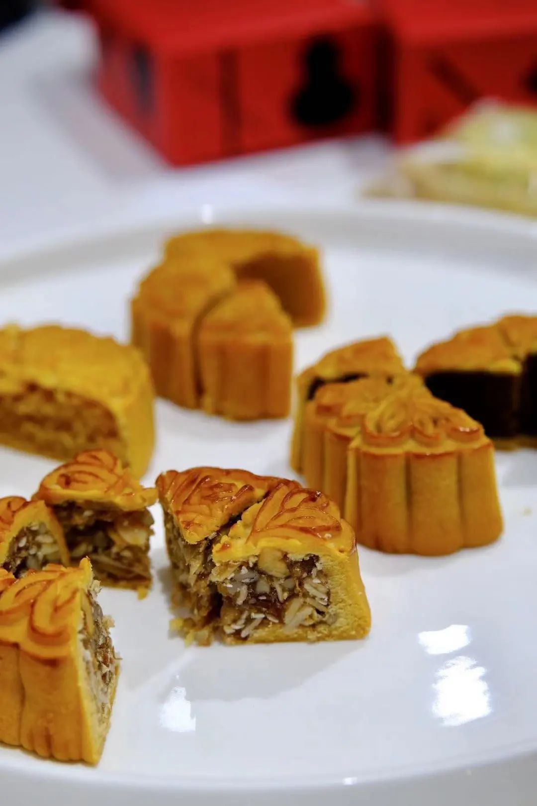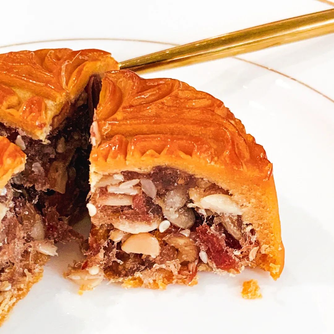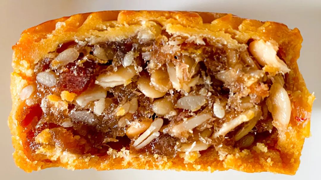 切开,横切面就能看得一清二楚。那一点点火腿,把完全的甜味扭转过来, 火腿的咸香散开,反而成了五仁油脂香气的绝佳脚注。