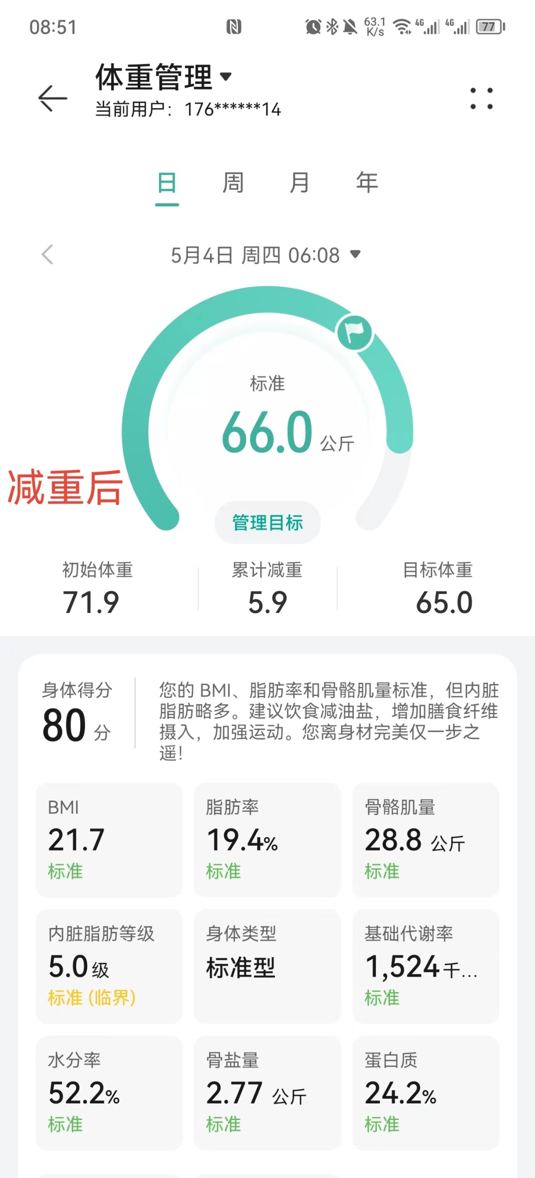 经过各位老师的指导和自己的努力(清淡饮食,坚持运动),体重成功减掉10kg,在不到两个月的时间餐后血糖已经可以稳定在7.8以下。