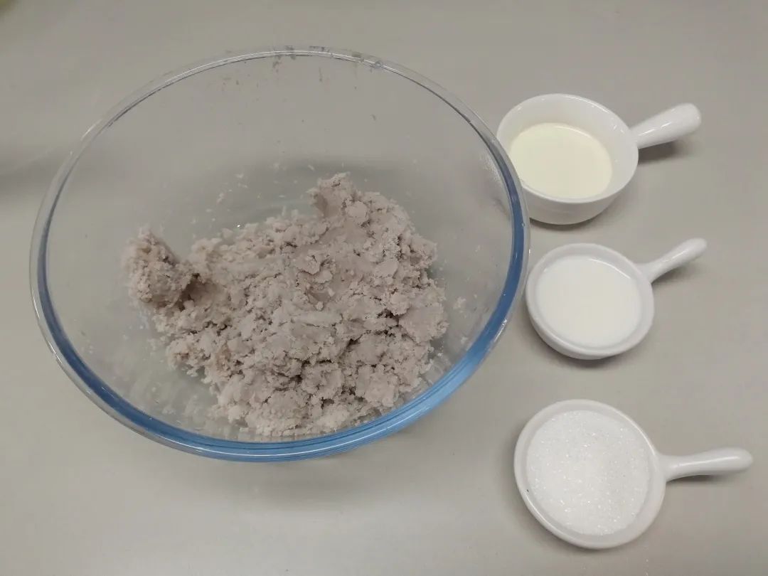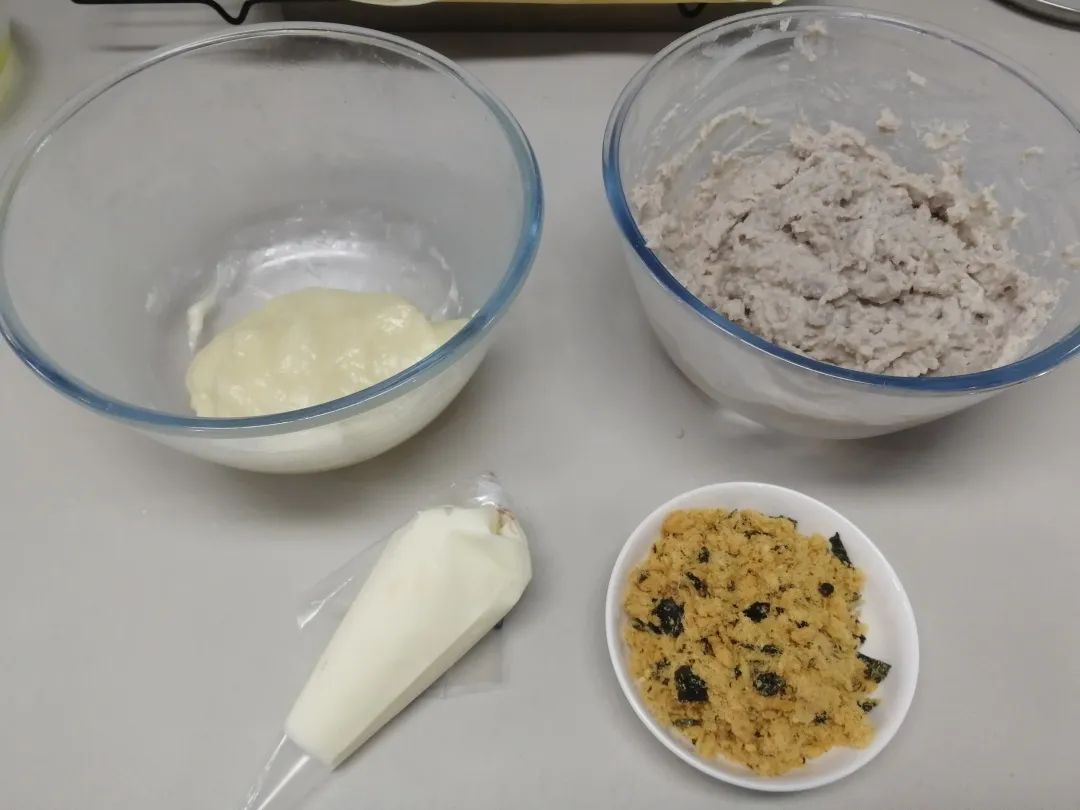可多准备20g牛奶进行调节面糊的软硬程度,准备芋泥馅料食材