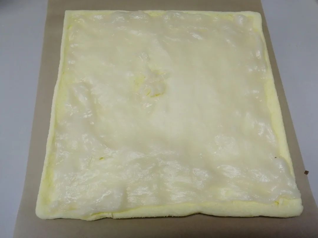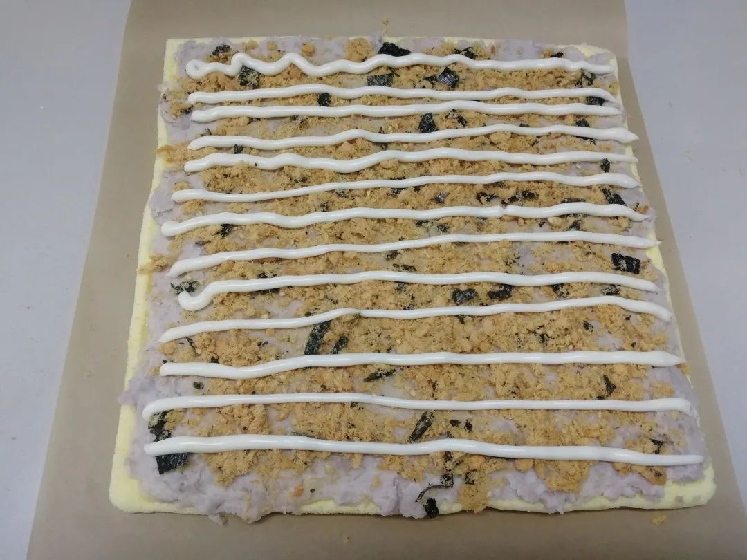 准备肉松和沙拉酱,将麻薯馅料平铺在凉至常温的蛋糕卷上面