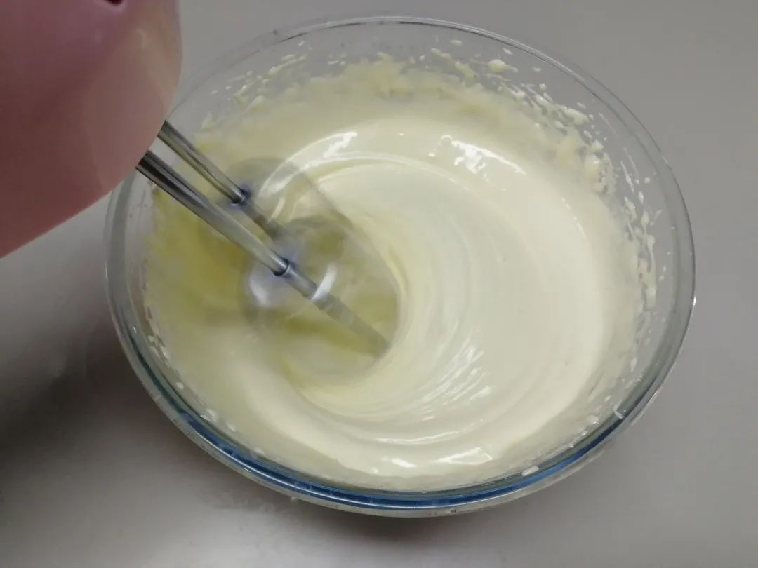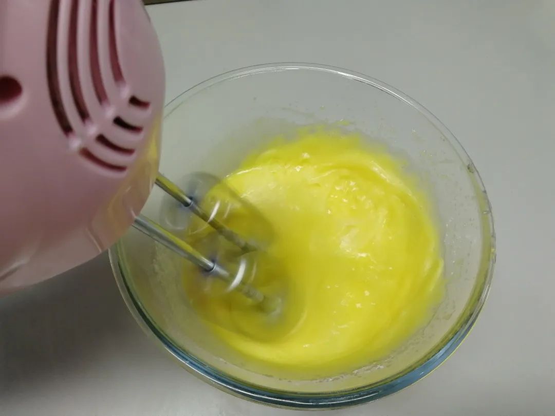 采用电动打蛋器打发蛋黄,将蛋黄打发至乳白色,出现纹路即可,倒入28*28烤盘中