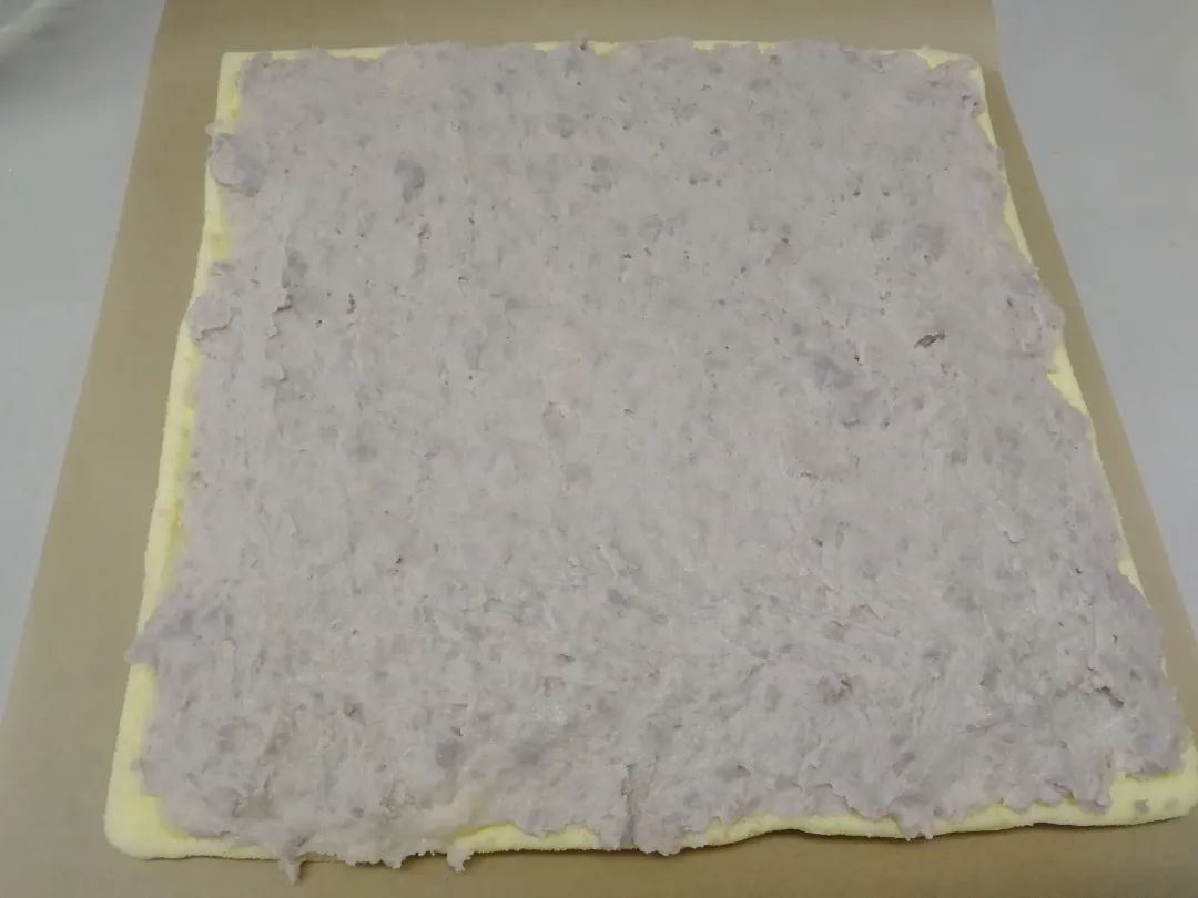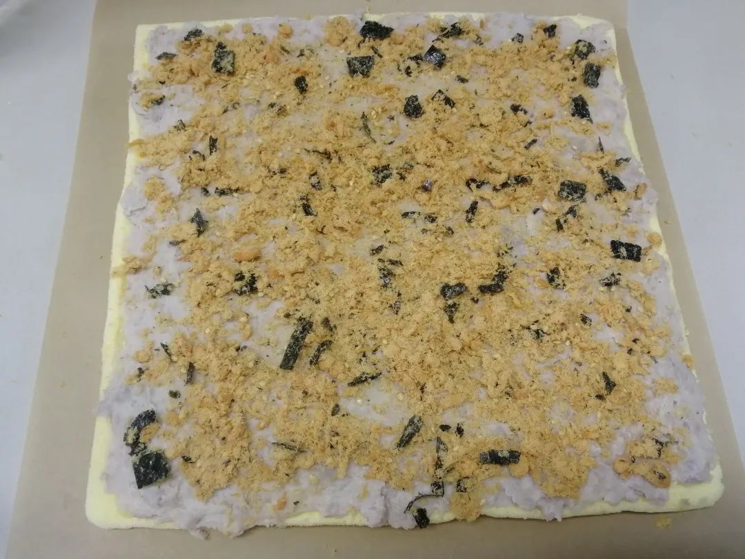 搅拌均匀细腻的芋泥馅料涂抹在麻薯上面,撒上肉松