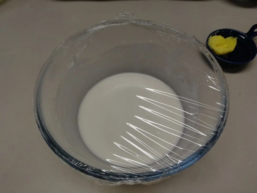 盖上保鲜膜上锅蒸制20分钟即可,取出蒸好的麻薯加入黄油,并搅拌均匀,揉至细腻光滑