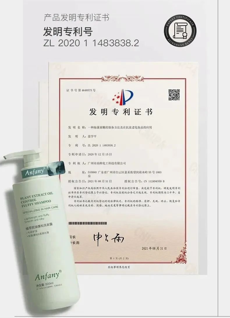 获得国家产品发明专利!要知道市面上含有专利证书的洗发水少之又少!