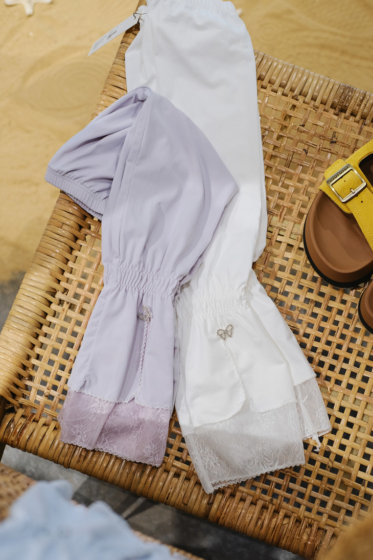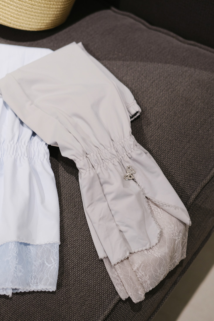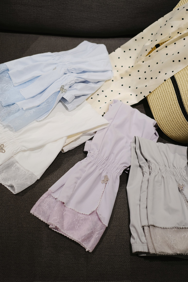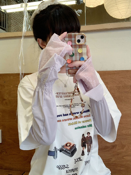 2、凉感拼蕾丝款:冰丝面料手腕处亮钻蝴蝶结搭配蕾丝花边,雾霭紫/冰川蓝/珍珠白/高级灰四种颜色可选,防晒力叠满芭蕾少女氛围感~38℃高温也能甜度超标!
