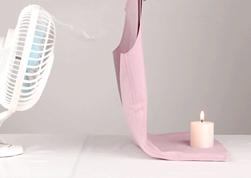 我们用风扇模拟寒气侵入,把风扇开到最大,风速非常的大,但是在保暖背心背后的蜡烛的烛火却纹丝不动,可见保暖效果。