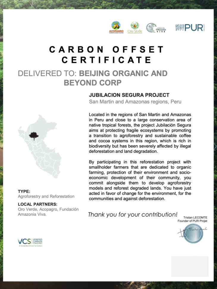 依托全球性可持续项目PUR Jubilación Segura Project,正谷与巧克力生产伙伴 估算 下一年需要抵消的温室气体排放量。PUR Project联合当地农户一起 提前种植 足够可以吸收对应排放量的树木[6]。然后再根据实际情况从PUR Projet 购买相应数量的CO2证书 。该项目中的每位农户和每棵树木都在种植登记册中注册。此外,种植的树木通过GPS注册,因此可以使用代码通过Google Earth定位每棵种植的树木。所有未成活或已经死掉的树苗将会被替换。自2021年起,由碳阻迹提供碳中和技术支持,正谷 「 味道礼盒 」 中的正谷Ouroland有机奶酪、正谷100%伊比利亚火腿、Cavell瑰夏咖啡以及其他正谷食品均实现了从生产到配送的净零排放。以2024年新春1998型正谷 「 味道礼盒 」 为例, 1份正谷「味道礼盒」从原材料生产到配送阶段的碳排放抵消量为22144.10g。