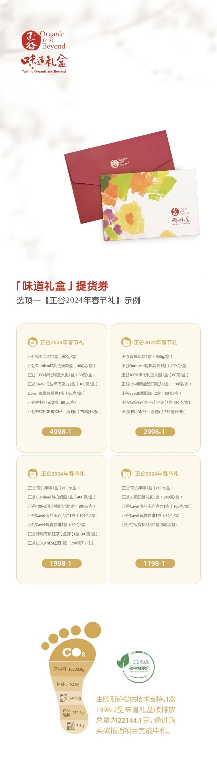 2024年新春正谷「味道礼盒」(提货券)在进博会期间发布,并以4998、2998、1998、1198等规格为客户伙伴们提供“表达美好情感”的用心的礼品选择,美好情感里传递的是人与人之间的真挚情谊,同样包含着人与自然和谐的愿望。