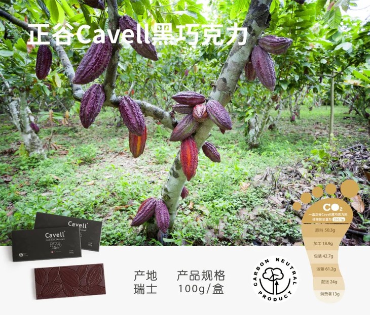 2012年,正谷Cavell黑巧克力就获得了碳中和认证。正谷与瑞士巧克力合作伙伴,对可可原料、加工、包装、运输、配送以及消费后废弃包装的产品全生命周期碳排放进行核算,并通过在秘鲁圣马丁和亚马逊的植树造林项目进行抵消。1盒Cavell黑巧克力(100g/盒)的碳排放总量为210.1g,而每盒Cavell黑巧克力的碳汇成本约为0.02元。