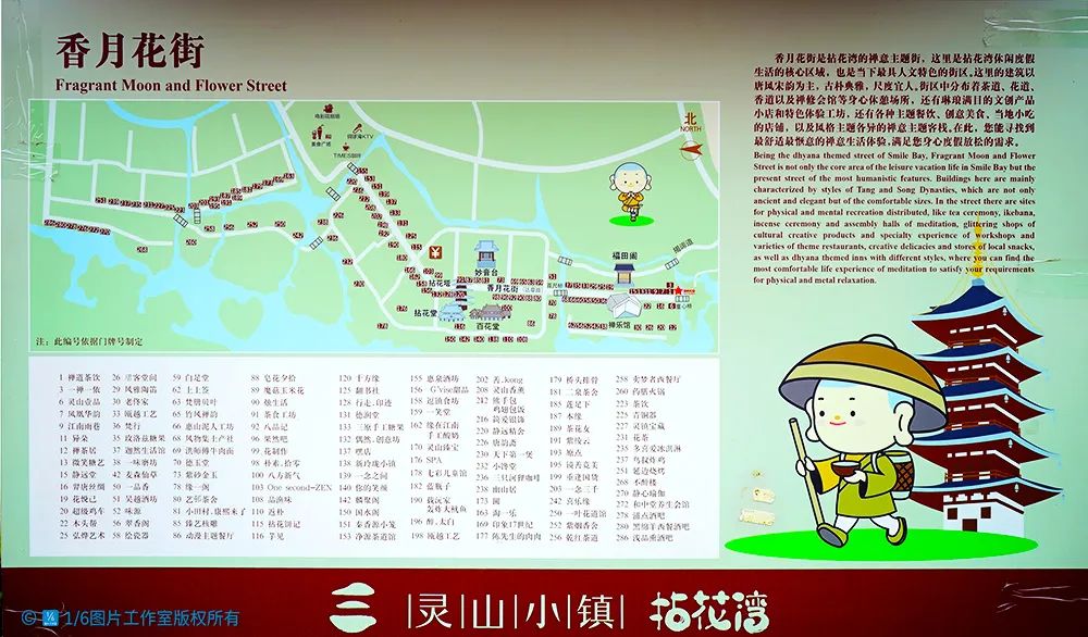 香月花街是拈花湾禅文化大动脉,也是拈花湾休闲度假生活核心区域。街区中分布着茶道、花道、香道及禅修会馆等身心休憩场所,还有琳琅满目的文创产品、特色体验工坊以及风格主题各异的主题客栈。从这些商铺名称,你就能直观感受到其中浓浓的佛禅文化,如迦然生活馆。