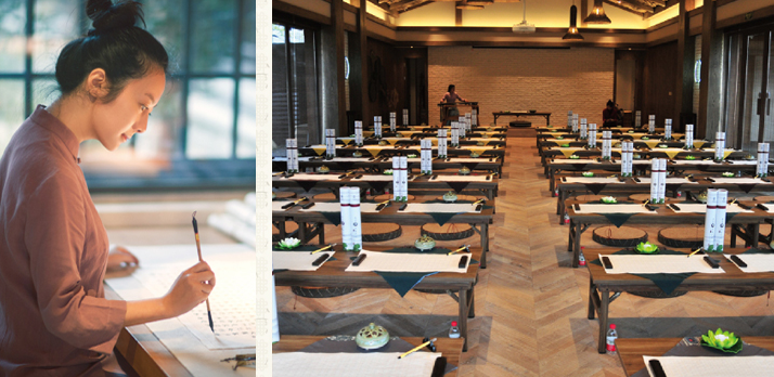 拈花湾里,邻水湖畔,在静心禅乐空间——远山堂,安享着美好的自然风光,静静的抄完一段经文,过着心里静静后的快乐生活。一张桌案、一笔一墨,在空白上抄写一段经文,犹如在人生中刻写自己的心路,字字入心。