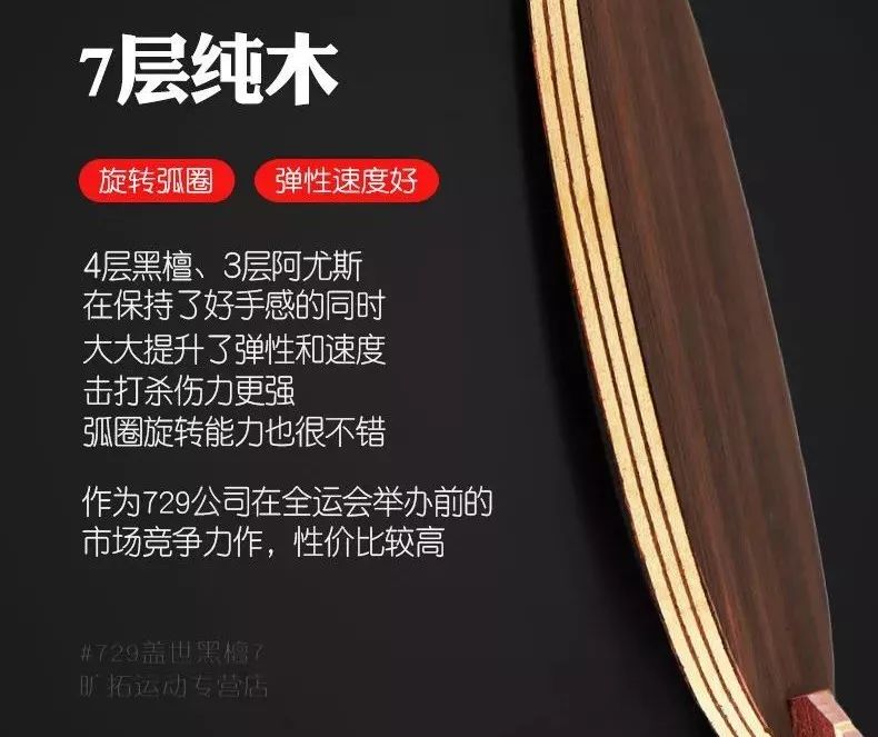 横板:由于其足够暴力,只有基本功扎实,发力科学的球友才能驾驭,否则您只能从黑檀5来过渡啦!那么有人就问了,这么暴力那么发力的时候这球还不无底线乱飞啊,还控得住吗?这点不用担心,这种特有的七夹结构中的较薄的夹在两片较厚黑檀中间的阿尤丝是729技术人员做过特殊工艺加工处理的,有效地起到了压缩蓄力的作用,避免了黑檀的生硬反弹,这个蓄力的一刹那使得球在球板上足以被持住,因此不会有脱板快难以控制落点的感觉。