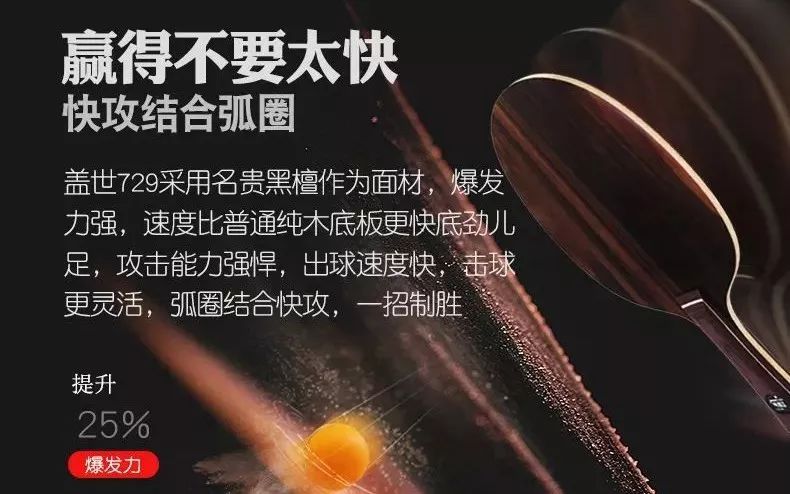 直板:适合有一定基本功,单面左推右攻或者直拍横打两面弧圈的球友。729盖世黑檀5,由于729技术处理过的黑檀作为面材在小球方面只要你稍有动作比如挑打,快搓,撇晃等,这些力就会迅速反馈到球上,出球干净利落,毫无拖沓感,而且球比较听话,控得住,很大程度提高命中率,减少失误。中远台发大力的主要感受就是球被板子先撞住送出的感觉,底劲十足,有多大的力道都会被板子如实传导,很难出现所谓的天花板现象。尤其要说的一点,在暴冲半出台下旋或不转球的时候手感反馈明显,有蓄力并瞬间爆发的感觉,如果你手法够专业当你冲上这一板的同时,这球已经开始在对方球台以极贼的弧线下落了,很难防御。