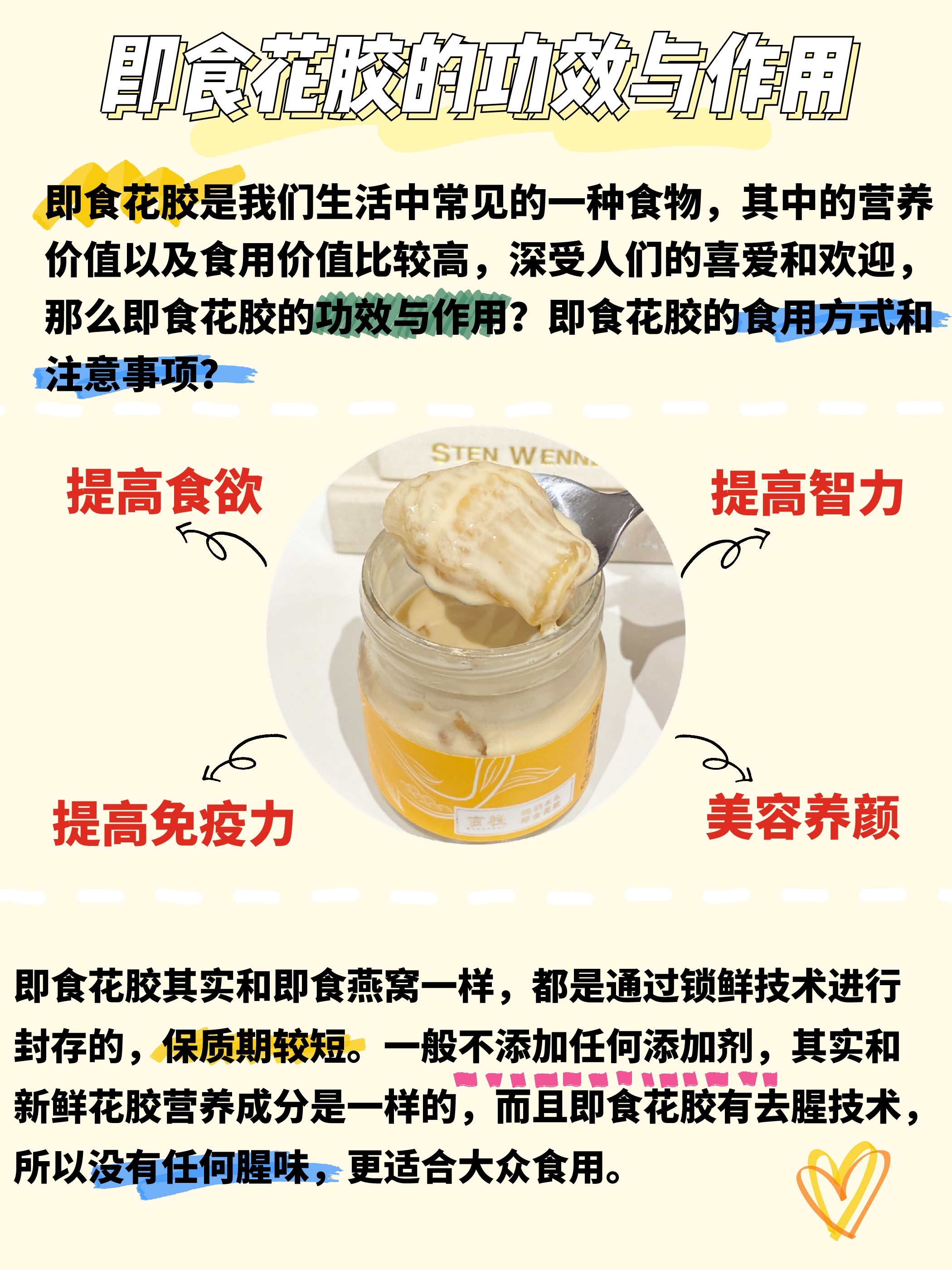 即食花胶其实和即食燕窝一样,都是通过锁鲜技术进行封存的,保质期较短。一般不添加任何添加剂,其实和新鲜花胶营养成分是一样的,而且即食花胶有去腥技术,所以没有任何腥味,更适合大众食用