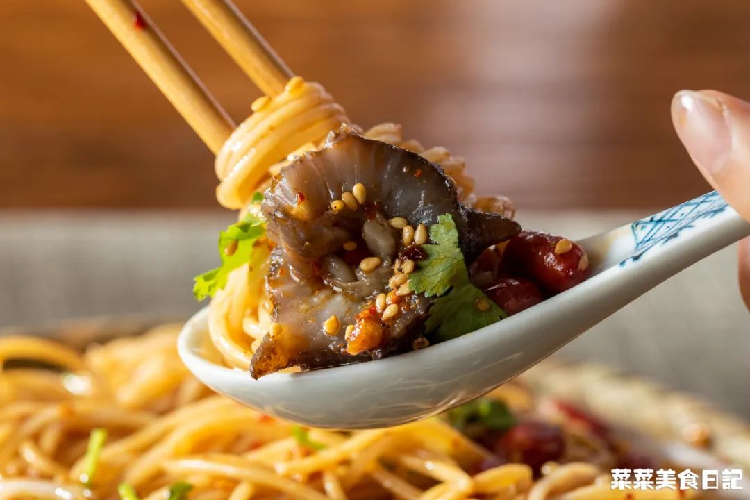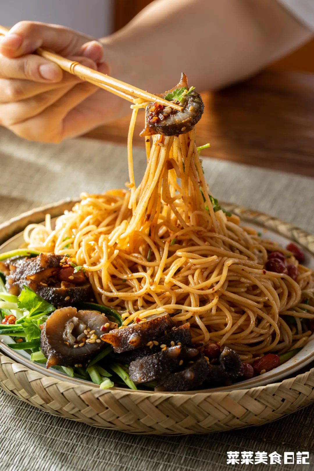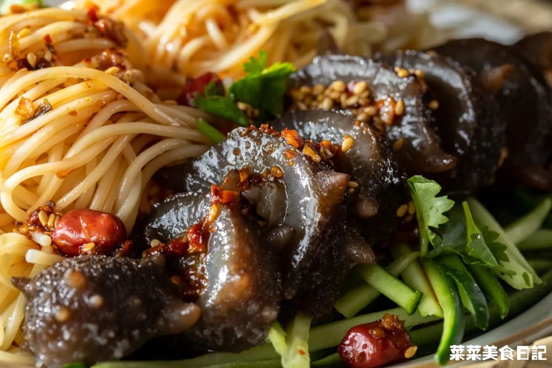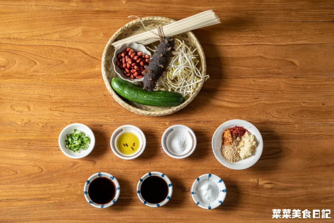 凉面是圆润有嚼劲的弹牙,海参是厚实会陷进去的弹牙,再有花生米的香脆、黄瓜丝的爽脆。牙齿上蹿下跳,榨出麻辣回甜的汁水,每一口都是味蕾大爆炸!食材:海参1条 干碱水面80g 黄瓜50g 绿豆芽50g 炸花生米10g蒜末1大勺 葱末1大勺 辣椒面1大勺 花椒面1小勺 熟芝麻1小勺 热油3大勺 糖1小勺 盐1小勺 生抽1.5大勺 陈醋2大勺 葱油1小勺