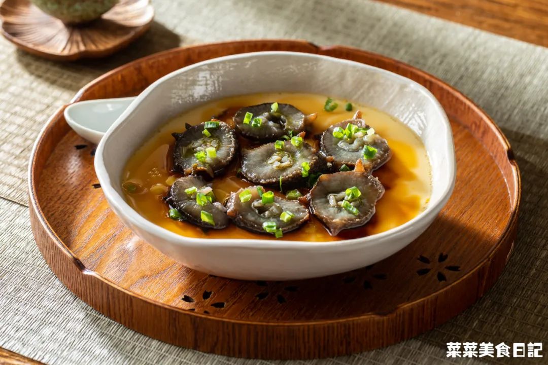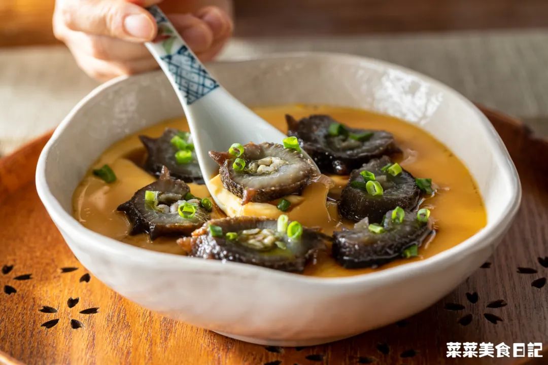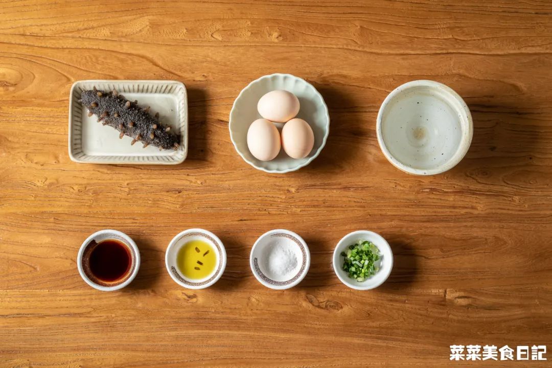两种优质蛋白碰撞,一个弹嫩,一个软滑,下到1岁小孩的辅食,上到老人家的营养餐,它都能胜任。食材:海参1条 鸡蛋3个 盐1小勺 温水200ml 蒸鱼豉油1小勺 葱油1小勺 葱花