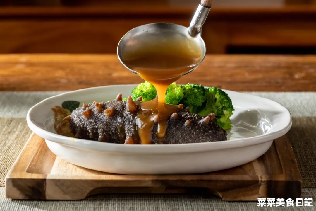2.鲍汁放入热水煮2-3分钟,取出淋入海参和西兰花杆食用