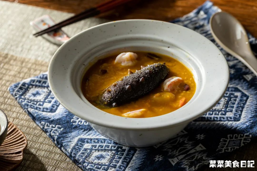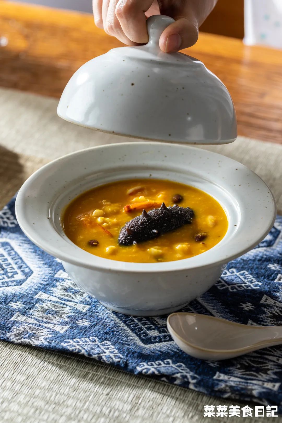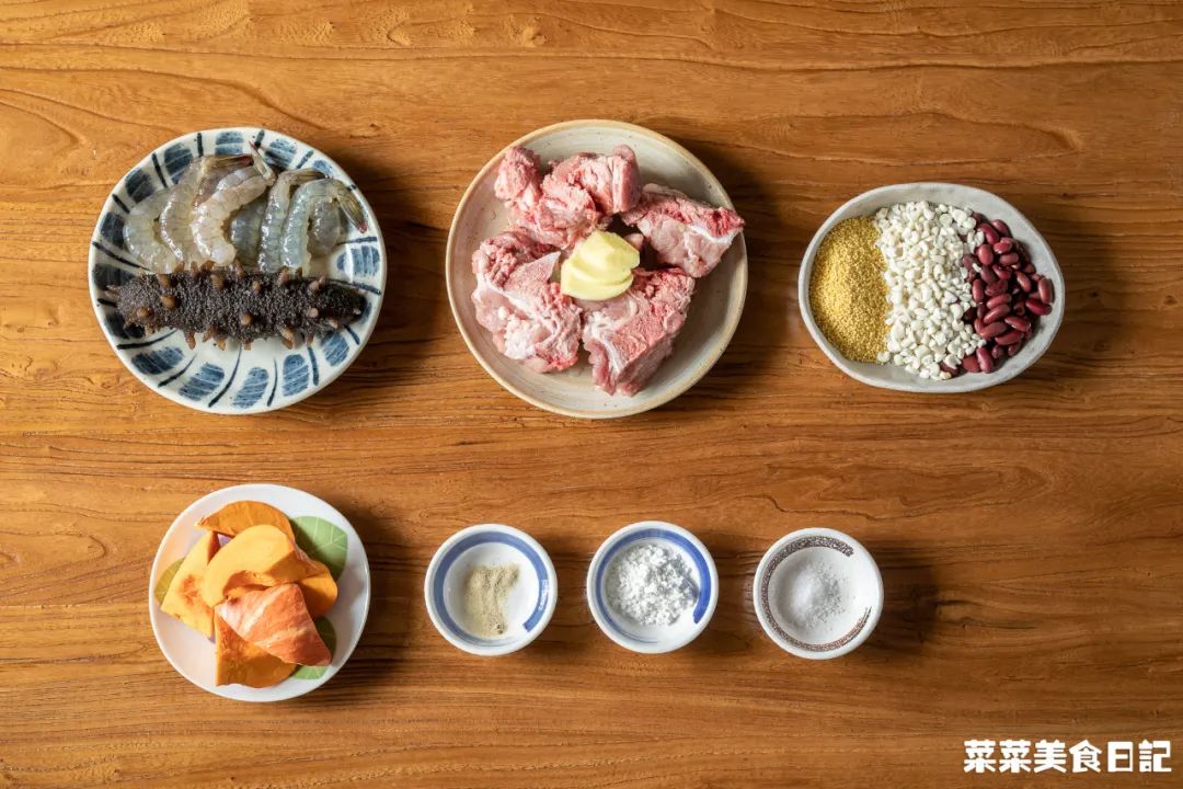 所谓金汤就是加了南瓜泥的高汤,比一般高汤多了南瓜的清爽鲜甜,色泽也更显贵气。在金汤煨煮之下,杂粮粒粒开花,海参软糯入味,汤底也吸取所有精华,变得鲜美浓郁、胶多粘嘴。这一盅既是例汤也是主食,宴请时压轴出场,准能赢得满堂彩!食材:杂粮粥底: 脊骨/鸡块300g 小黄米80g 糯玉米50g 花腰豆50g 姜片2片 清水3l配料:海参1根 鲜虾仁10个 南瓜蓉200g 盐1小勺 胡椒粉1/2小勺