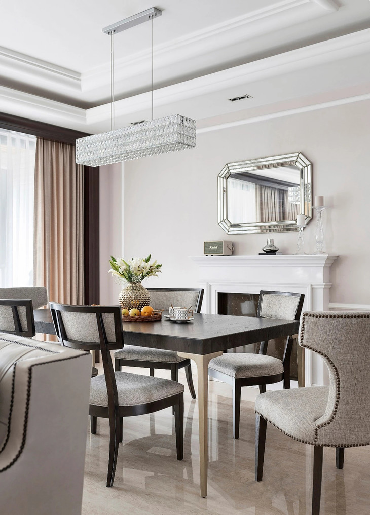 餐厅区域延续客厅空间的暖灰色系。自然清爽色调互补,个性的吊灯富有艺术气质,令人心动。样式简洁的美式桌椅即舒适又美观。配以黄铜等金属元素增添空间的轻奢质感。