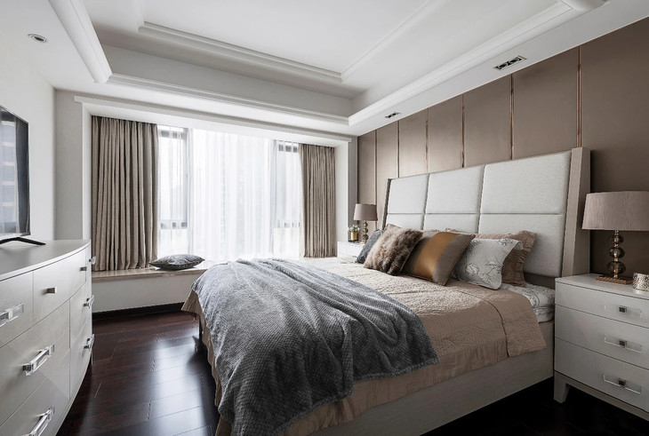 在卧室的设计上,设计师以舒适感为导向,结构加上素雅色调的软装,整个空间简而不凡,色彩上的运用给人优雅恬静之感。白色皮质高背美式大床在这个空间中与背景相互融合统一,美观和舒适感缺一不可。让身在其中的都能够享受到那一份宁静与舒适。