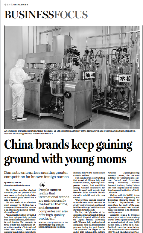 Chen Qiang, chairman of Burdock Biotechnology (Dezhou) Co Ltd, parent company of Mama &Sweeties, said: "In the past, US and European brands dominated more than 90 percent of China's baby and maternal market. But in recent years, we've noticed that homegrown brands are gaining acceptance among consumers, especially young moms." 妈妈亲亲母公司——博德生物科技(德州)有限公司董事长陈锵表示:“过去,美国和欧洲品牌占据了中国 90 %以上的母婴市场。但近年来,我们注意到国内自主品牌越来越被消费者接受,尤其是年轻妈妈。”