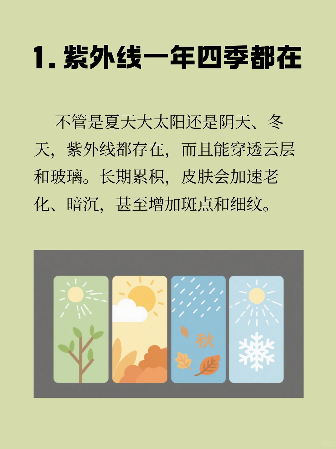 紫外线不会因为天气冷、太阳小就消失,它一年四季都存在,还能穿透云层和玻璃,日积月累对皮肤的伤害特别大。