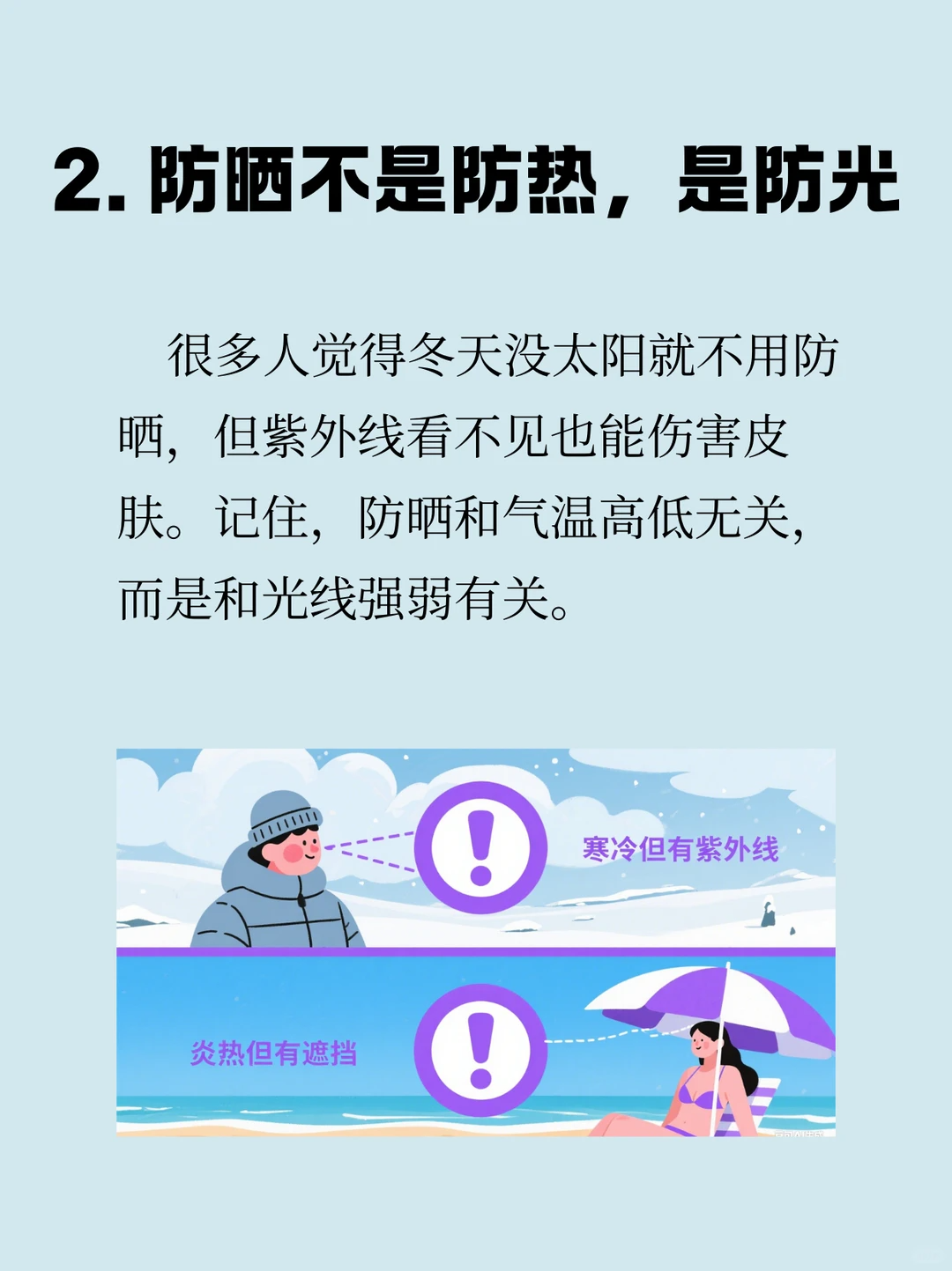 ❄️ 冬天:别以为太阳不大就安全了,尤其是下雪天,紫外线通过雪地反射,杀伤力更强。