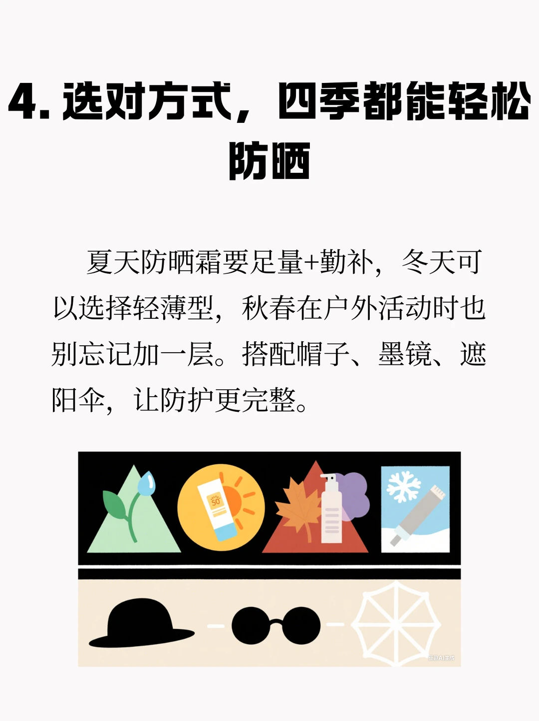 ☀️ 夏天:紫外线最强,除了防晒霜,帽子、墨镜、遮阳伞也要安排上,多重防护才安心。