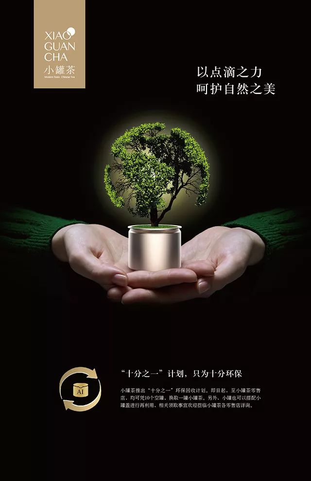 事实上,环保理念是小罐茶始终放在首位的。用铝这种材料做小罐本身,便是出于环保的考虑。对铝罐和铝膜进行再熔化即可完成对其的回收,这一过程只需消耗很少的能源。经过熔化的铝可以用于制造其他用品,无限循环利用。