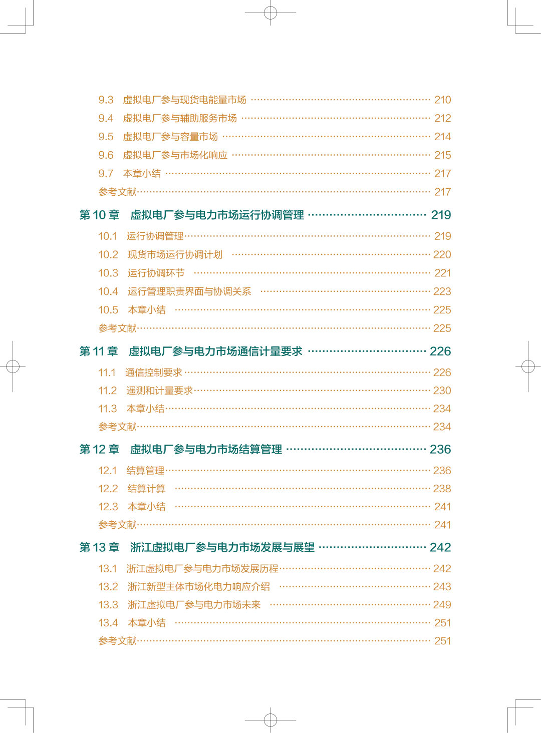 本书以虚拟电厂和电力市场为主要分析对象,全方面探讨虚拟电厂与电力市场的相互关系。全书共 13 章:第1 章强调虚拟电厂市场机制是新型电力系统建设的关键环节,介绍了新型电力系统发展及运行挑战,说明了电力市场参与机制是发挥虚拟电厂价值的支柱,以及虚拟电厂参与市场机制的关键问题;第 2 ~ 4 章分别介绍美国(以纽约州为例)、德国和英国虚拟电厂参与电力市场机制,主要包括电力市场概述、分布式资源整合模型、市场准入与注册管理、各交易品种参与流程与要求、各交易品种结算、运行协调流程、通信控制和计量要求等方面内容;第 5 章介绍国内典型省份浙江、广东、山东、山西虚拟电厂参与电力市场机制;第 6 ~ 12 章阐述了虚拟电厂参与电力市场机制总体设计、注册管理、技术能力分级及认证、交易品种、运行协调管理、通信计量要求、结算管理; 第 13 章介绍了浙江虚拟电厂参与电力市场的发展历程与未来展望。
