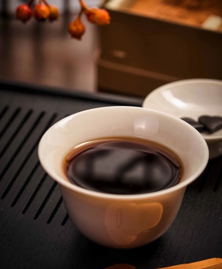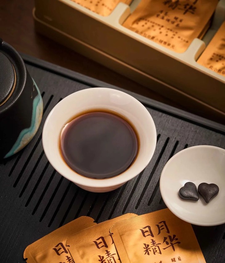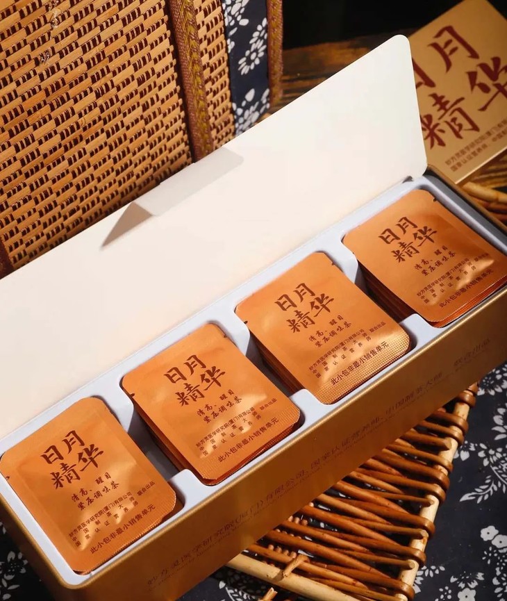 而日月六堡茶精,则采用15年窖藏的老六堡,整体茶韵非常醇厚。