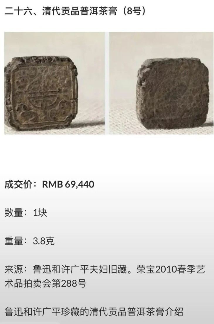荣宝2010春季艺术品拍卖会上,鲁迅先生收藏的3.8g茶膏,一块拍出高价!