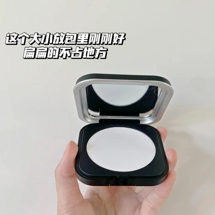 磨砂的黑色铁皮壳,有一定重量,有质感,非常薄,便于携带。银色金属包边,里面粉芯是圆形,自带镜子,方便出门在外随时补妆
