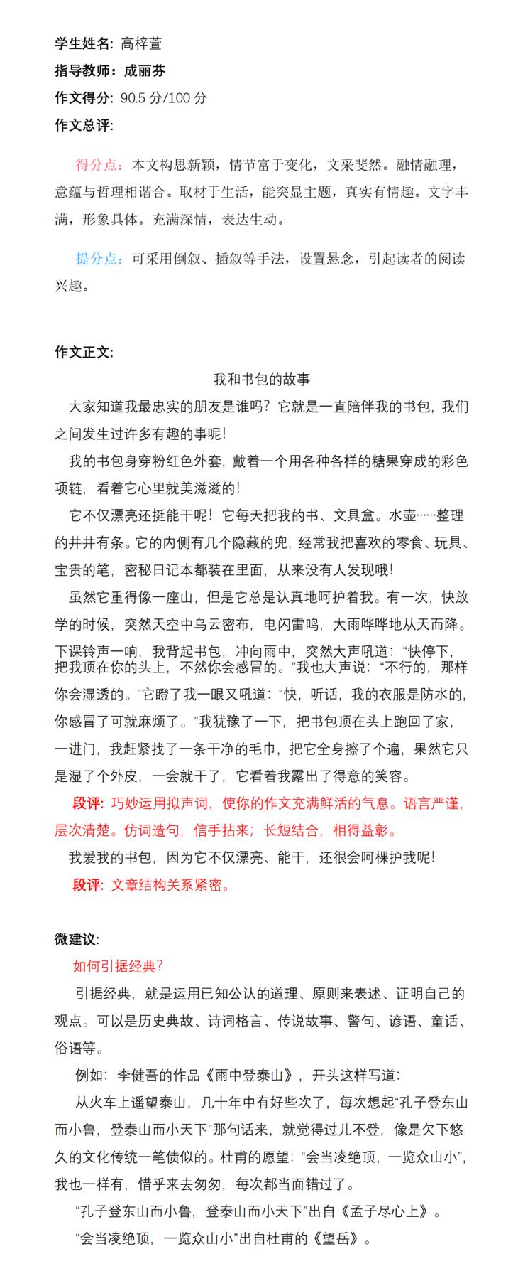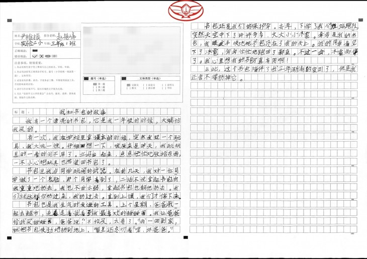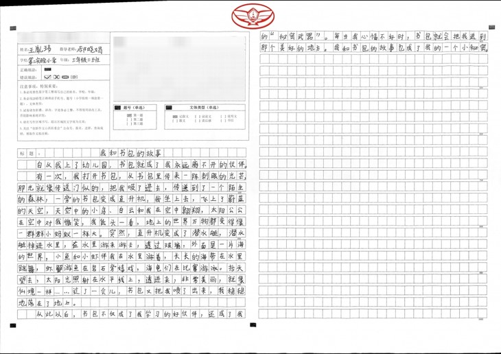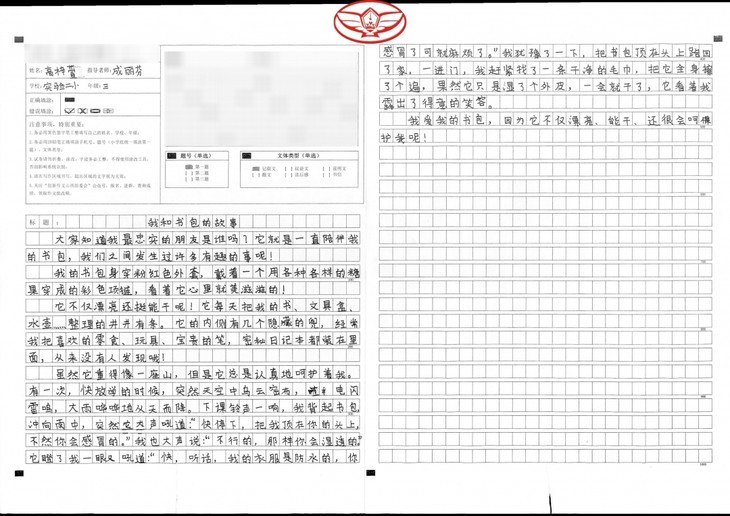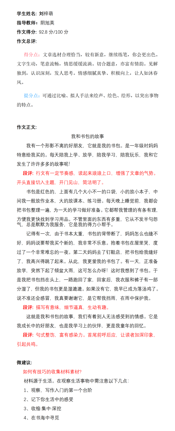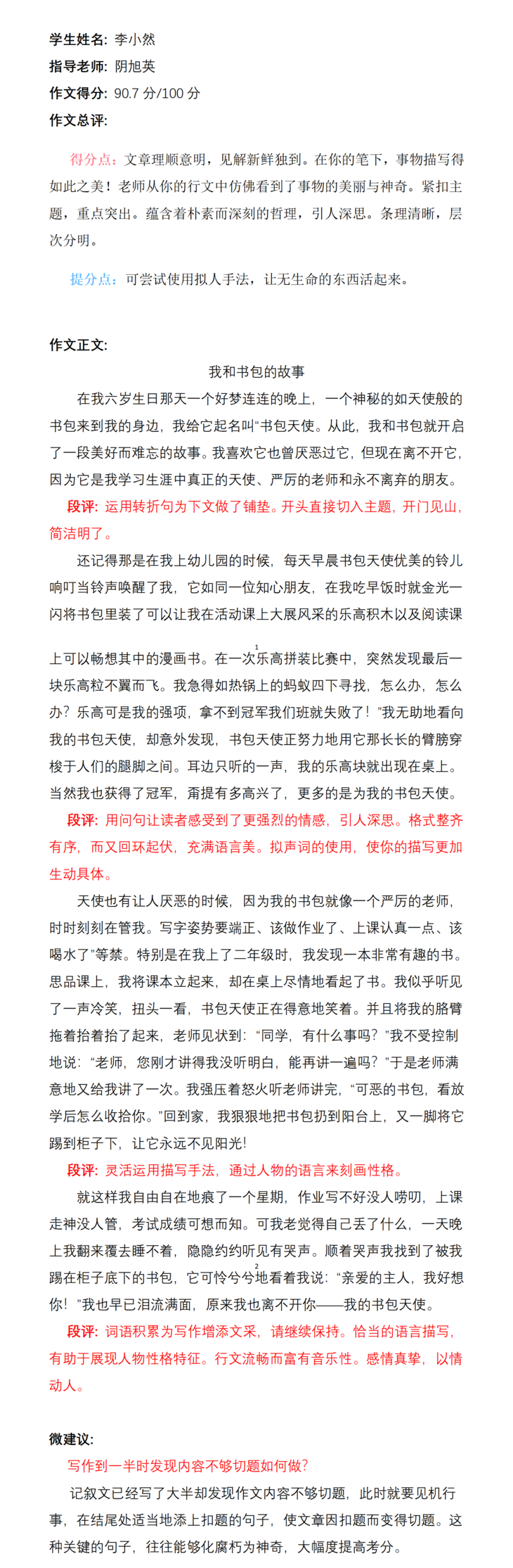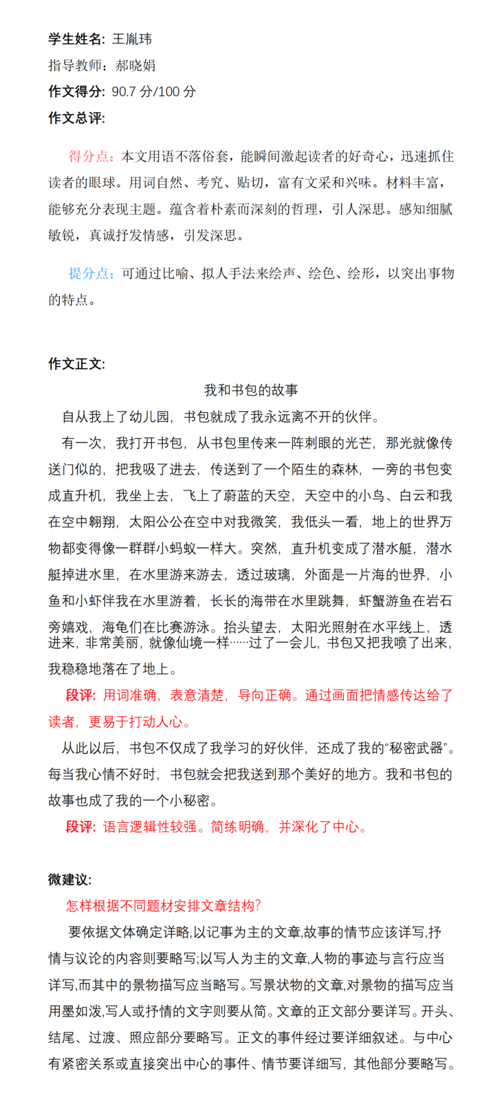 当作文与生活相遇,再邂逅美好的童年,于是精彩便有了无数种可能。有谁能想到,每天陪伴孩子们的普普通通的书包,却能在孩子们的笔下演绎出各种精彩纷呈的故事。这就是写作的魅力。孩子,做生活的有心人吧,用童心童趣和纯真去观察世界的美好,记录世界的美好,尽情想象,畅快挥笔。总有一天,你会发现用自己特有的文字让所有的精彩和美好成为永恒,那是多么幸福的事情!