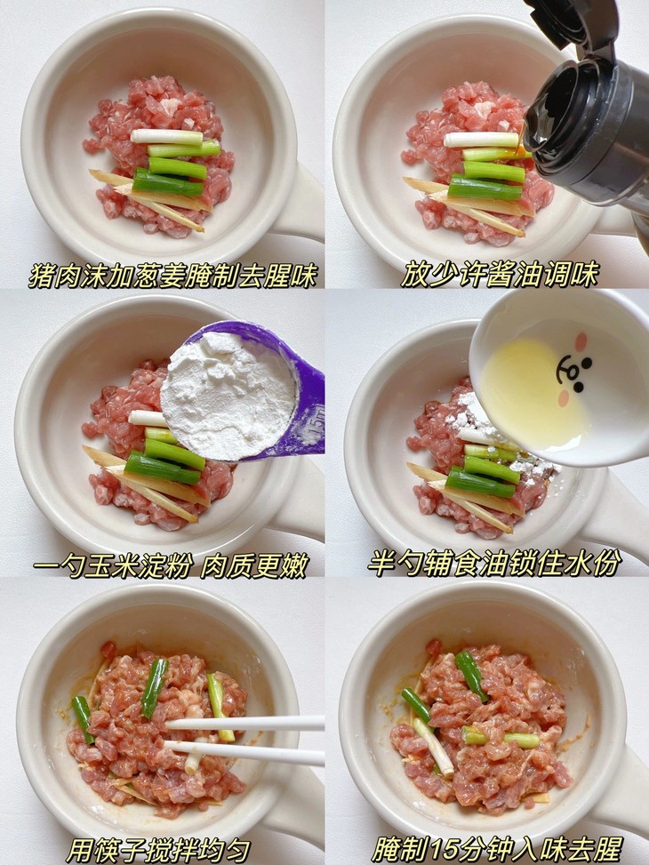 1️⃣冬瓜去皮后切薄片,猪肉剁碎,加葱段姜丝,少许酱油,一勺玉米淀粉,半勺辅食油锁住水份拌匀腌制10分钟去腥入味,这样炒出来的肉沫软烂不柴.
