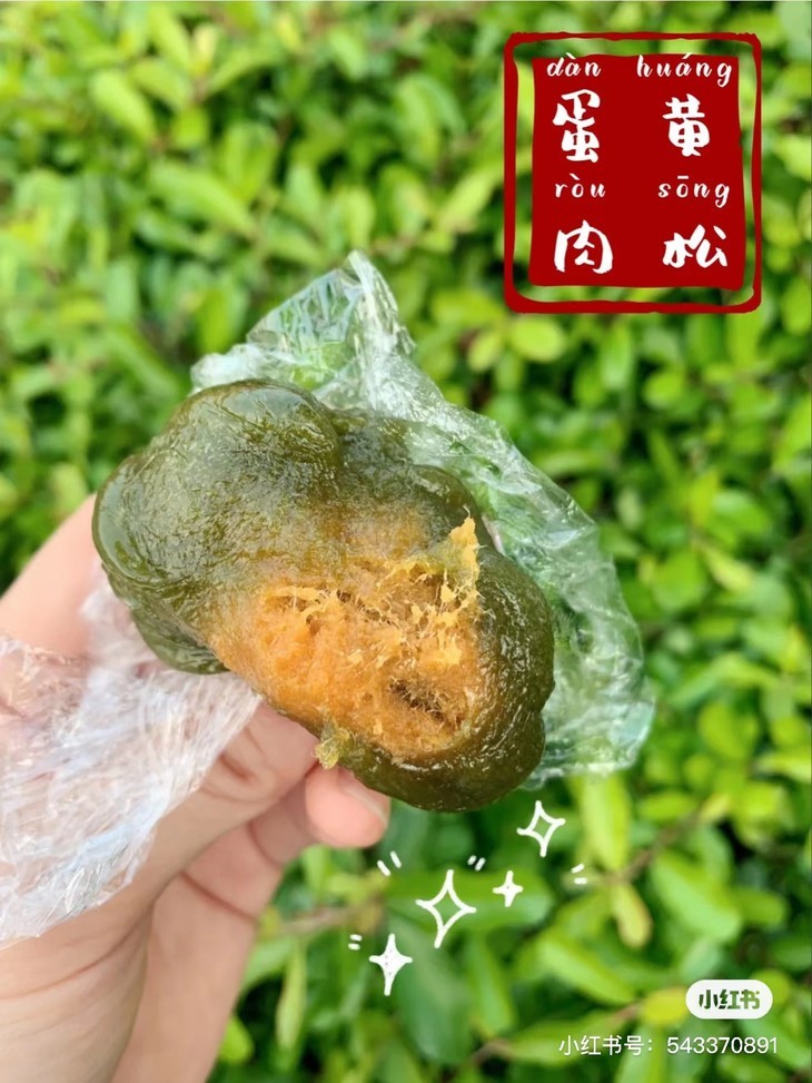咬开青团就能看到,蛋黄和肉松满满当当挤在糯糯叽叽的青团皮儿里,简直太香了!